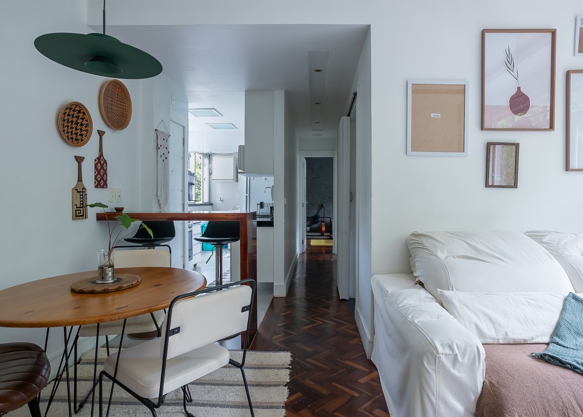 O apartamento foi reformado há poucos anos, e o cuidado no projeto é evidente. O antigo quarto de serviço foi integrado ao quarto principal, criando um ambiente mais amplo e confortável, sem perder o charme de um imóvel com pé-direito alto e tacos de madeira que trazem calor aos ambientes.