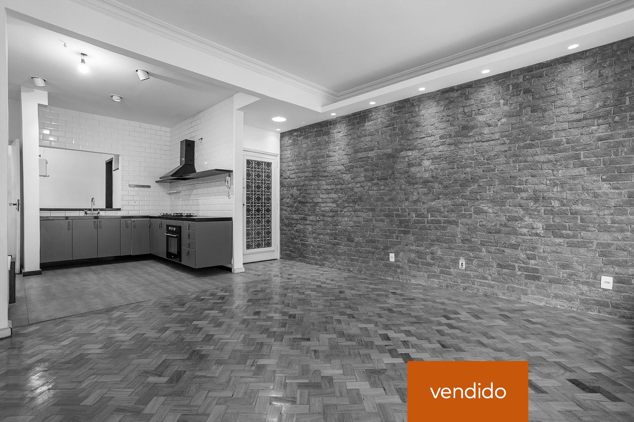 E a sala… Uma janela enorme, quase do teto ao chão, com jardineira pra se encher de plantas lá fora. Some a isso o chão de taco, pé-direito alto e uma parede de tijolinhos, além da integração com a cozinho, e você tem um cenário com potencial para ser um dos espaços mais charmosos e aconchegantes que se poderia querer.
