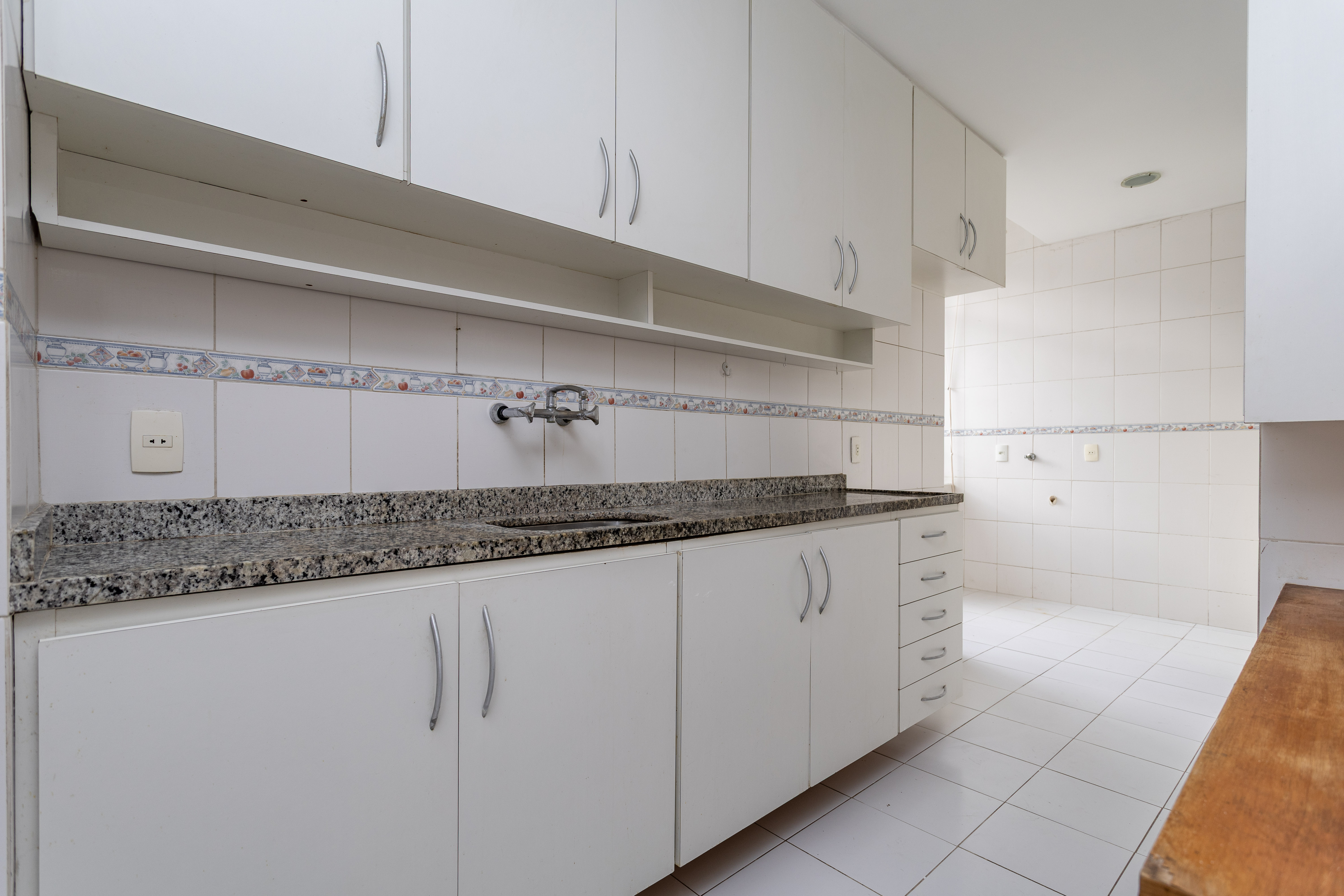 A cozinha é bastante agradável, atende muito bem à sala e conta com espaço para uma mesa de apoio às refeições do dia a dia. É um ambiente confortável para se permanecer, bem iluminado e ventilado pela ótima janela da área de serviço. As dependências são completas.