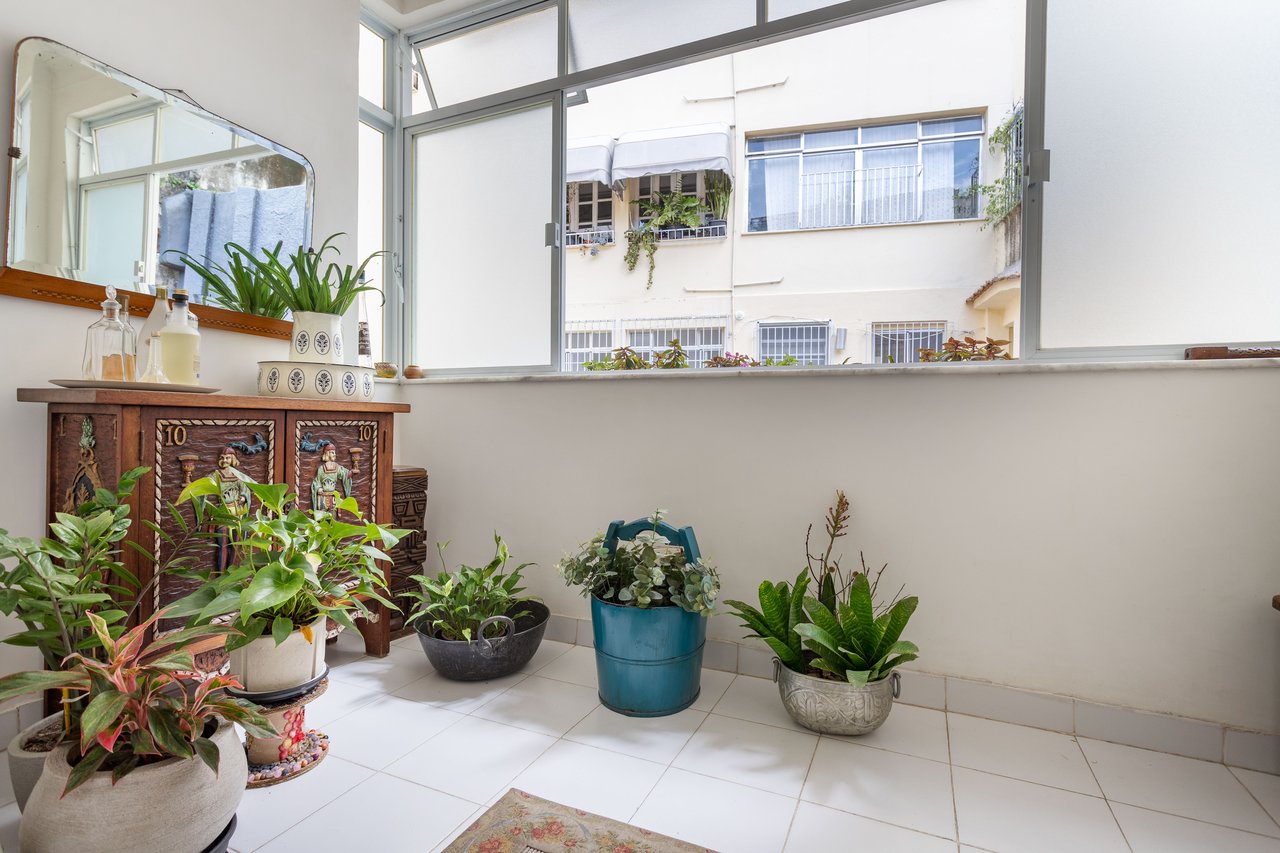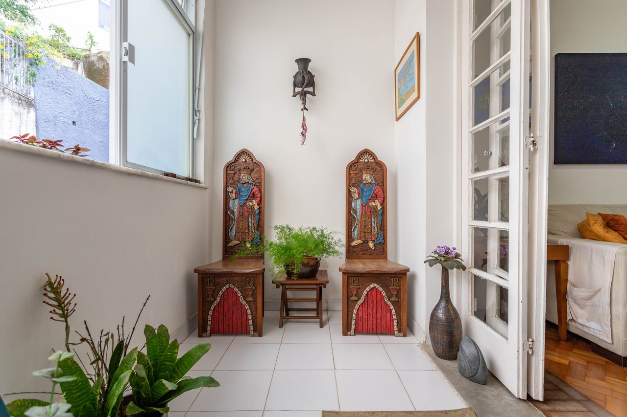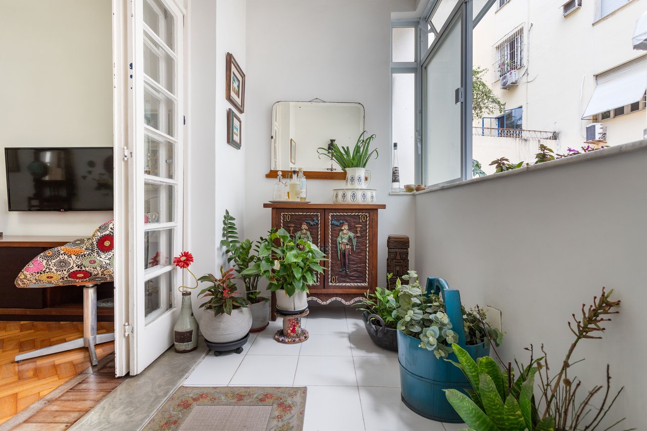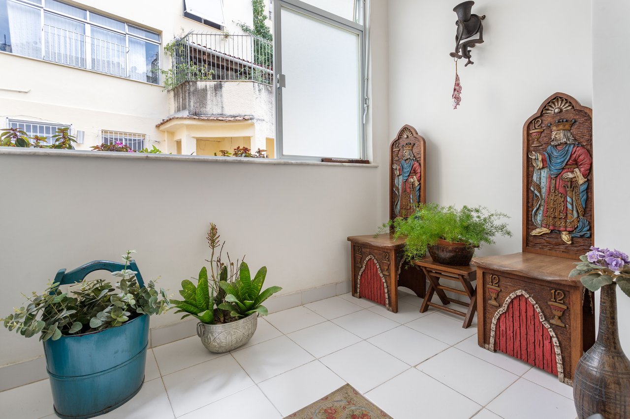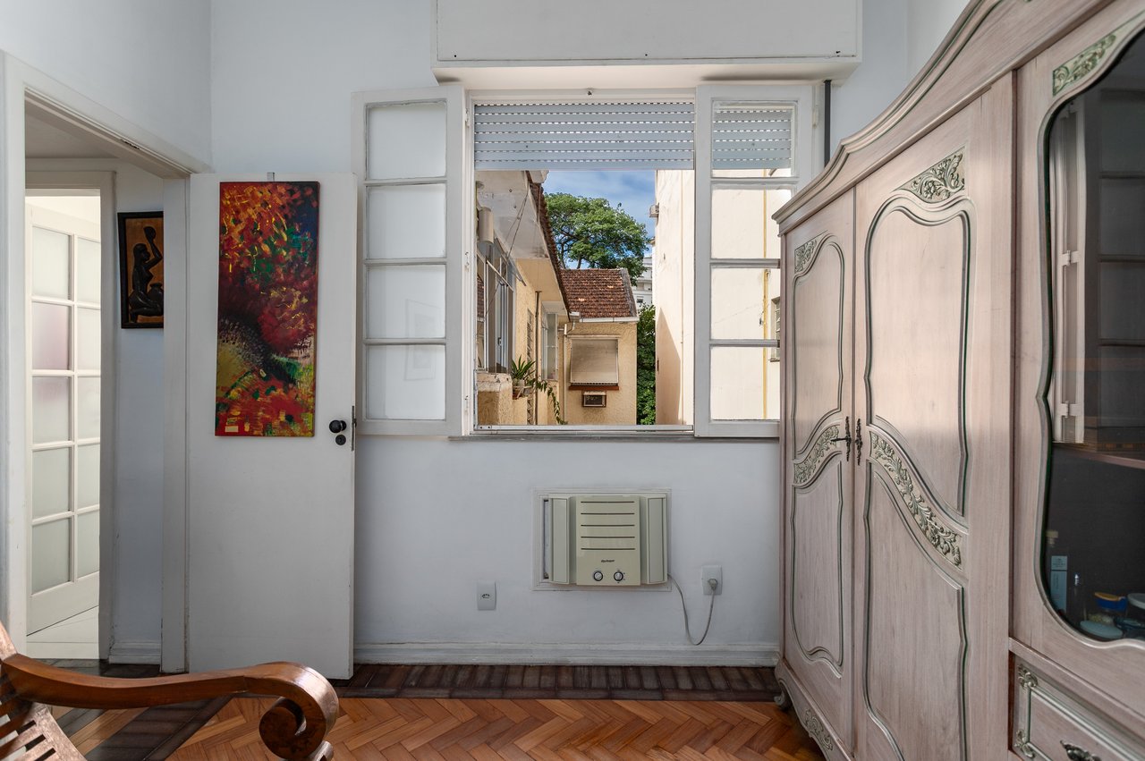 O apartamento fica no terceiro andar, e se os lances de escada são tranquilos para você, ótimo, pois lá em cima o apartamento compensa: é claro, silencioso, ventilado, com pé-direito bem alto e toda a tem toda a atmosfera gostosa de um “prédinho” clássico de Laranjeiras. O chão de tacos de madeira e as portas originais que se abrem para a varanda reforçam esse charme. A varanda é um espaço muito agradável, cabendo muito bem uma poltrona de leitura, plantas e até uma rede... um cantinho especialmente gostoso neste apartamento.