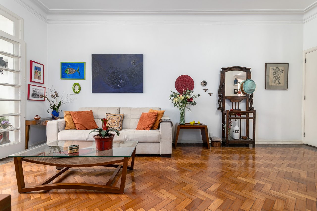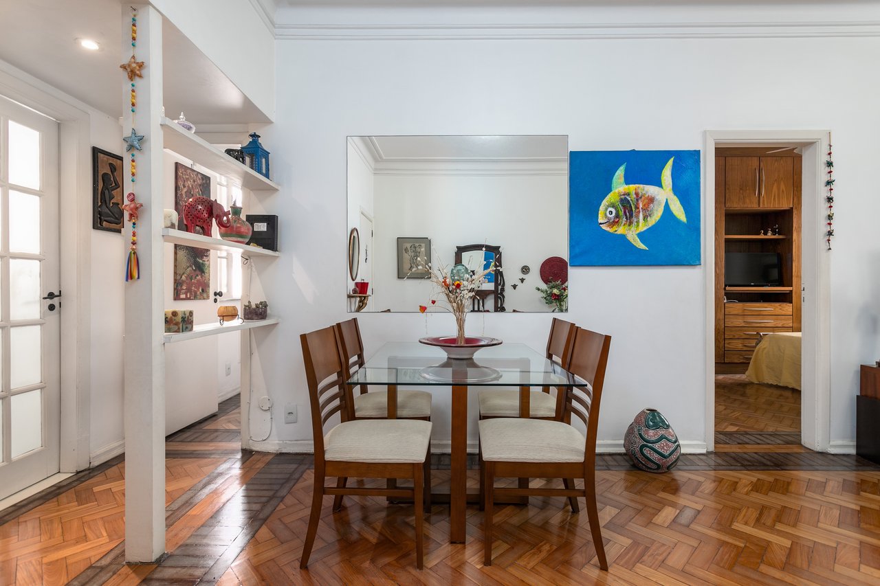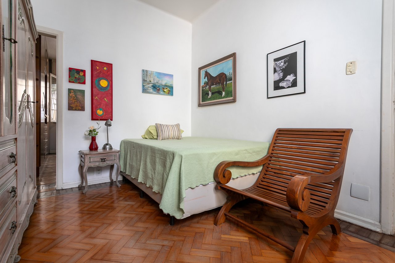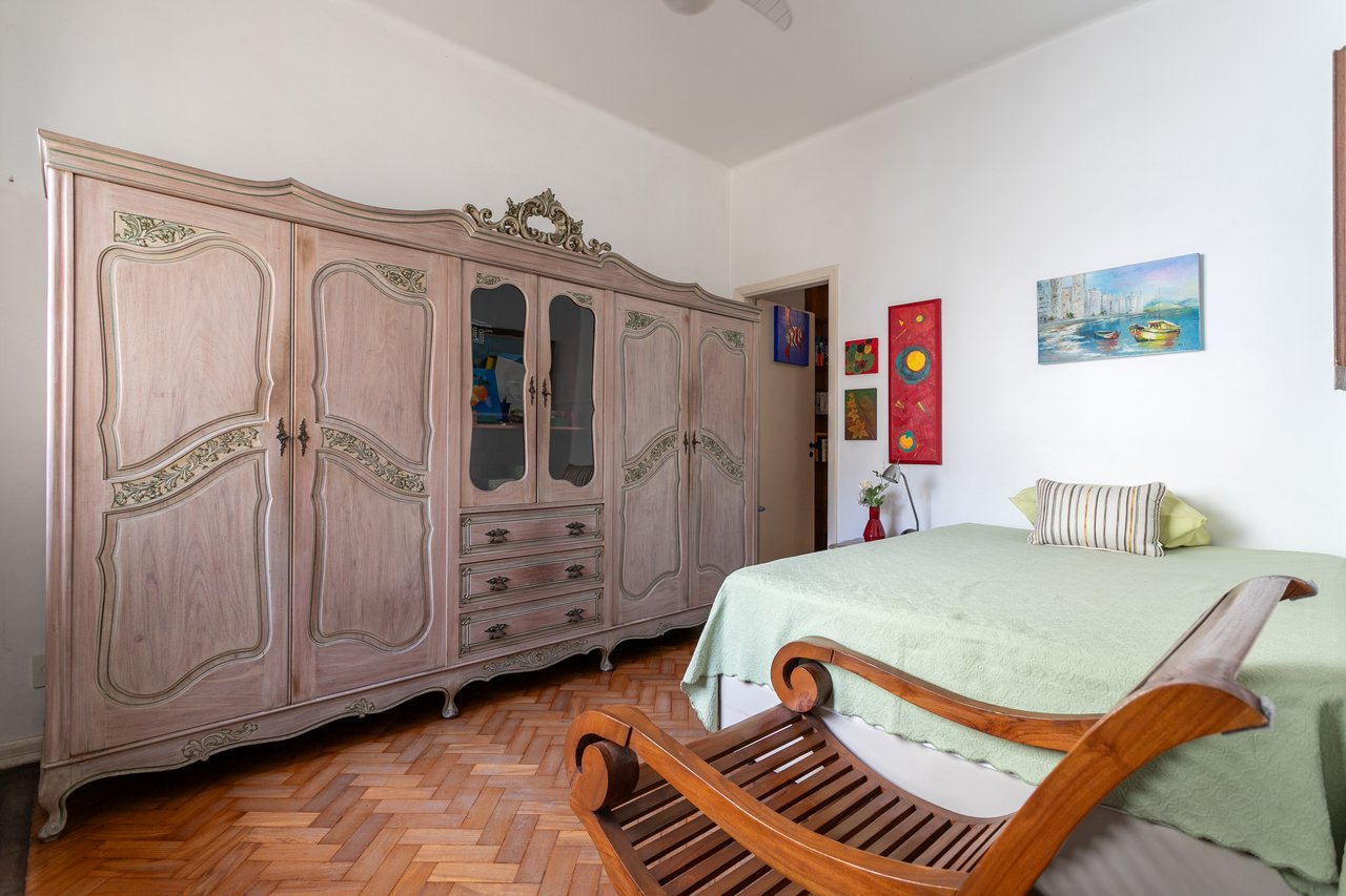O apartamento fica no terceiro andar, e se os lances de escada são tranquilos para você, ótimo, pois lá em cima o apartamento compensa: é claro, silencioso, ventilado, com pé-direito bem alto e toda a tem toda a atmosfera gostosa de um “prédinho” clássico de Laranjeiras. O chão de tacos de madeira e as portas originais que se abrem para a varanda reforçam esse charme. A varanda é um espaço muito agradável, cabendo muito bem uma poltrona de leitura, plantas e até uma rede... um cantinho especialmente gostoso neste apartamento.