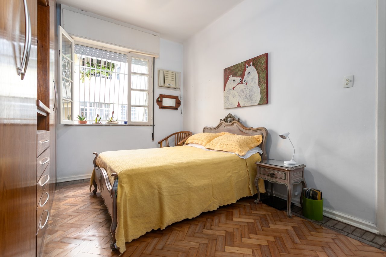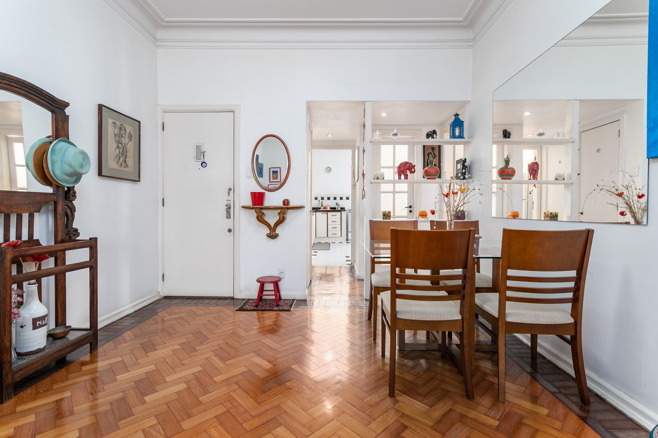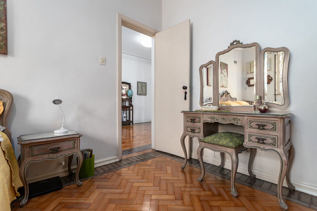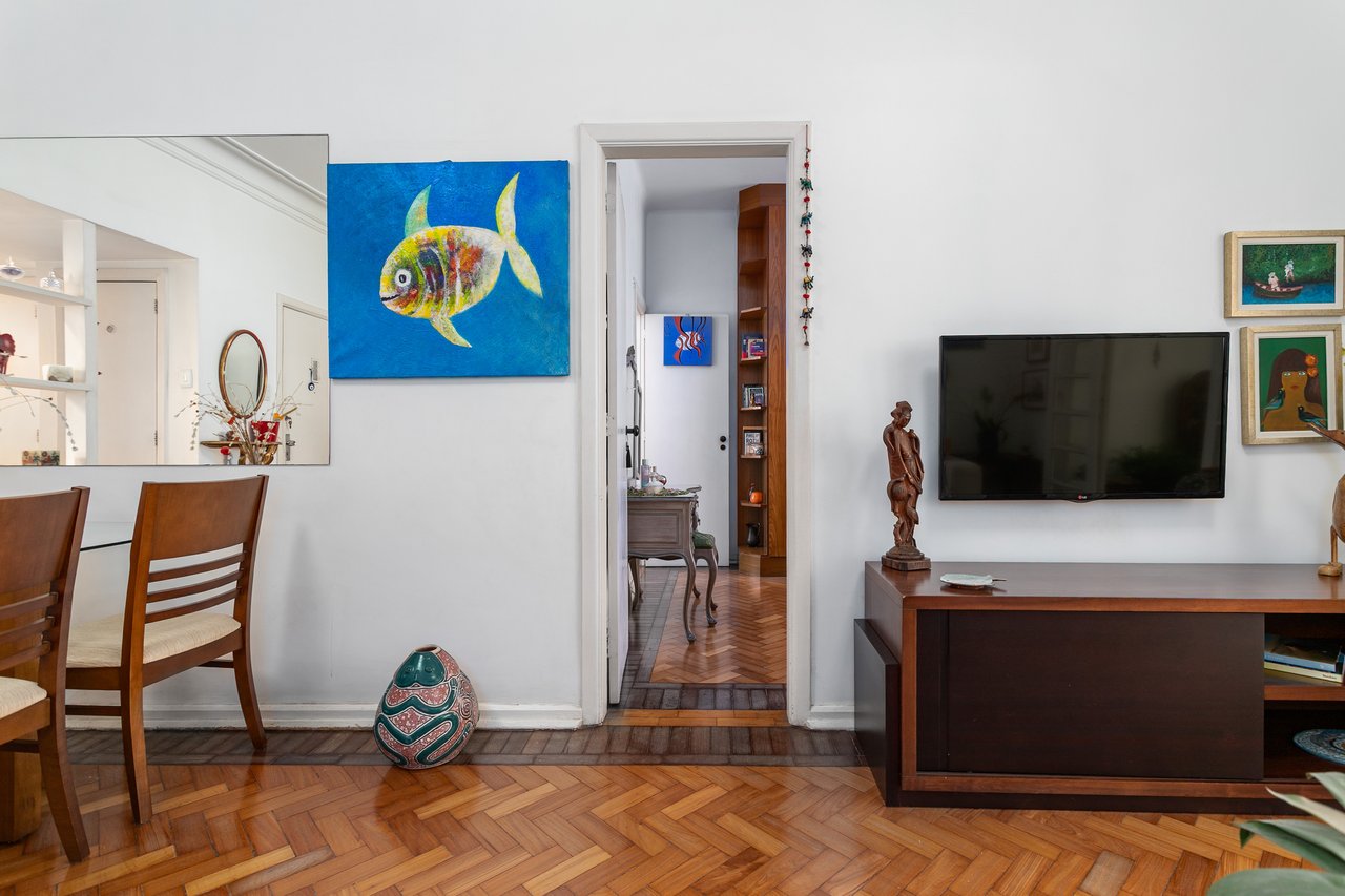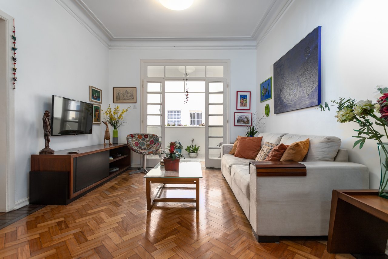 O apartamento fica no terceiro andar, e se os lances de escada são tranquilos para você, ótimo, pois lá em cima o apartamento compensa: é claro, silencioso, ventilado, com pé-direito bem alto e toda a tem toda a atmosfera gostosa de um “prédinho” clássico de Laranjeiras. O chão de tacos de madeira e as portas originais que se abrem para a varanda reforçam esse charme. A varanda é um espaço muito agradável, cabendo muito bem uma poltrona de leitura, plantas e até uma rede... um cantinho especialmente gostoso neste apartamento.