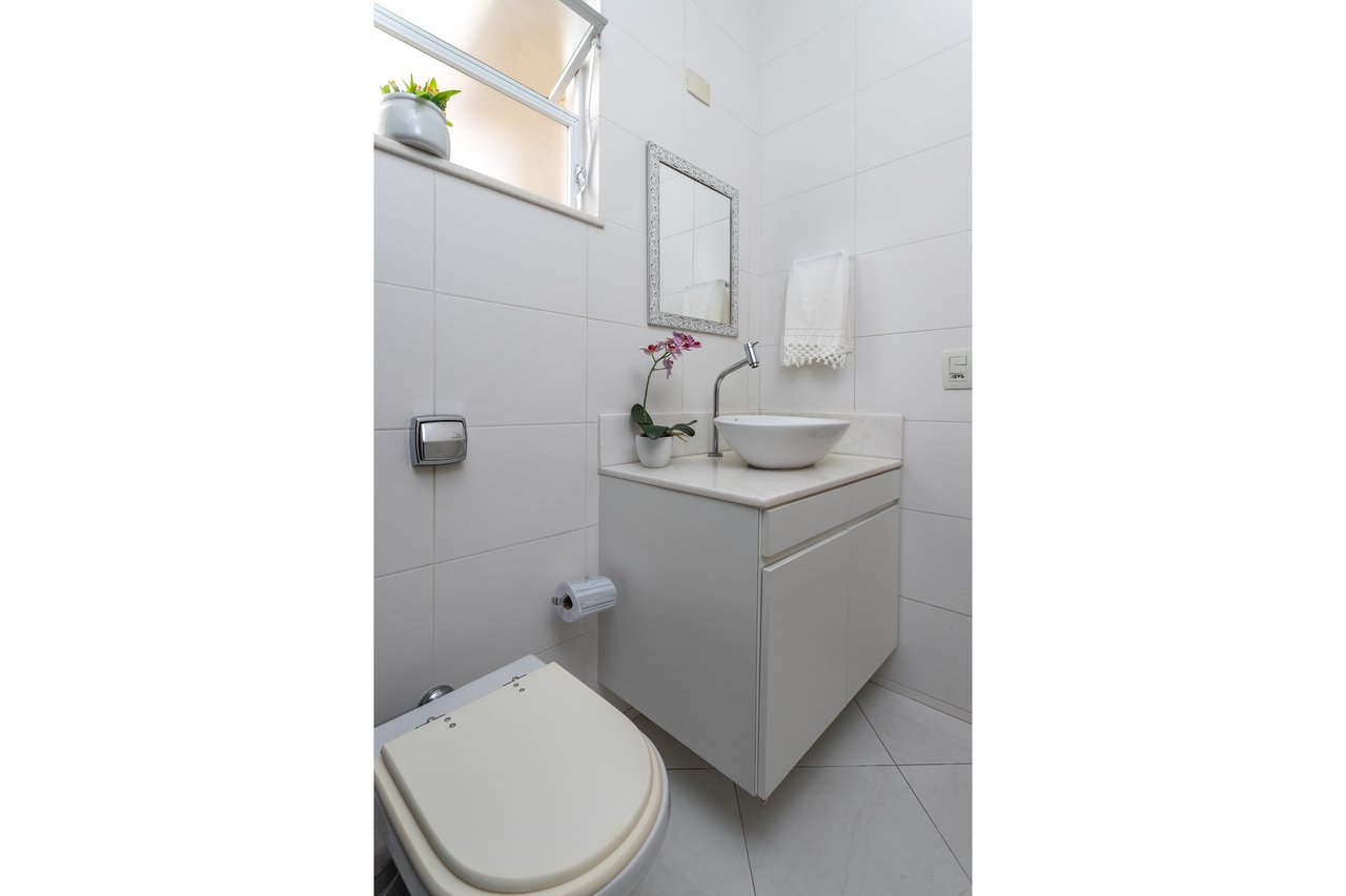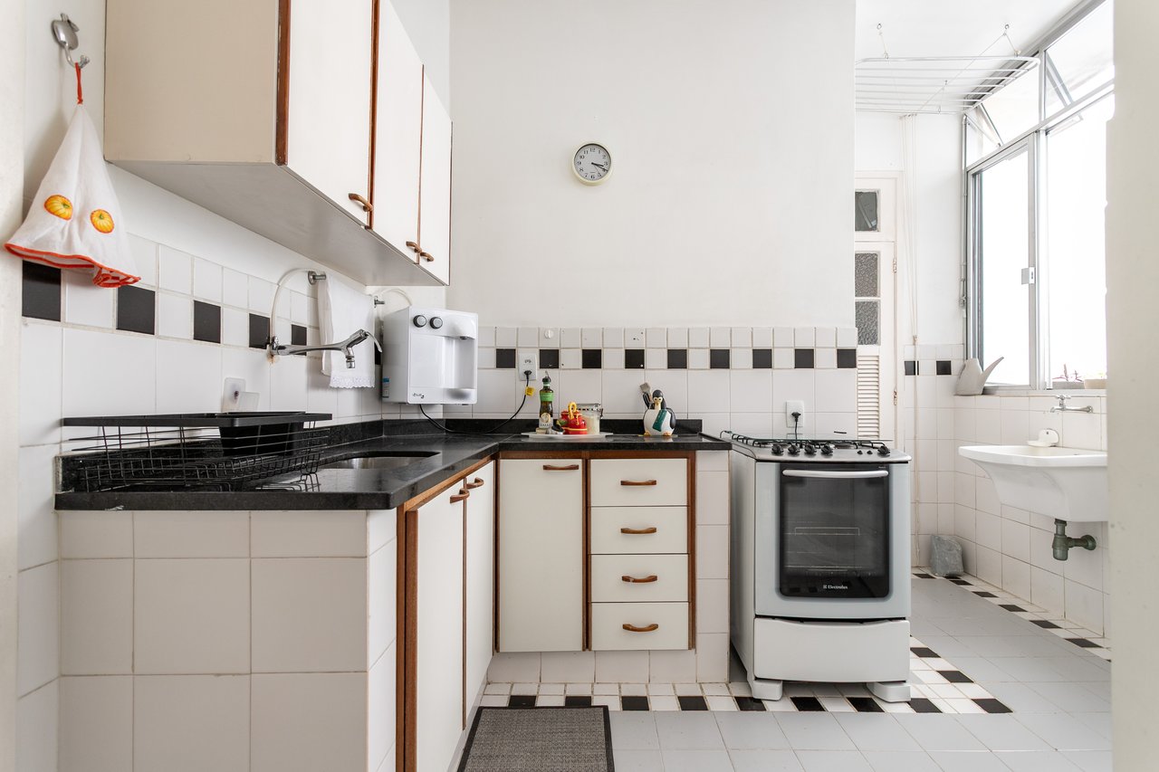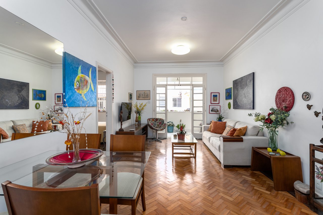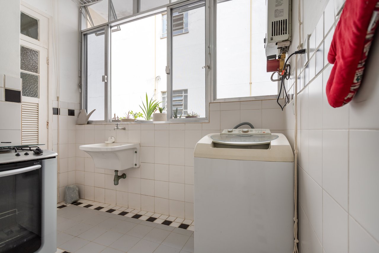 Os 102 m² no IPTU se distribuem entre uma ótima sala com varanda, dois quartos, um banheiro social bem posicionado, espaçoso e com ventilação direta, as dependências completas e uma cozinha clara e bem ventilada por uma janelona. A cozinha e o banheiro já passaram por modernização, com revestimentos brancos e neutros, fáceis para colocar ao seu gosto.