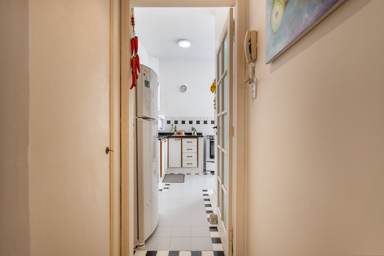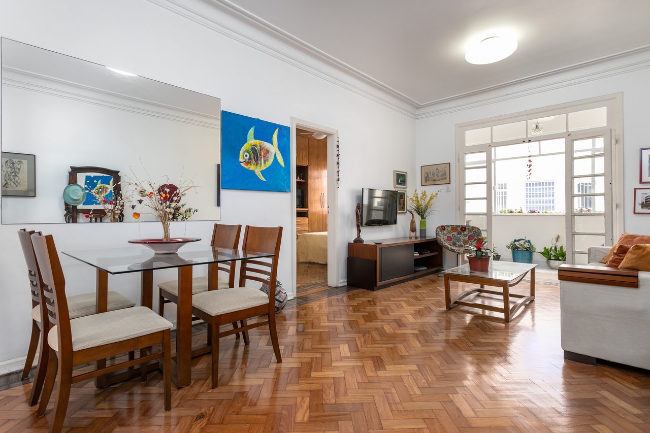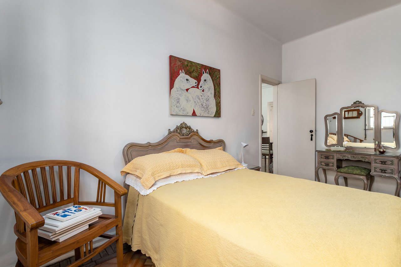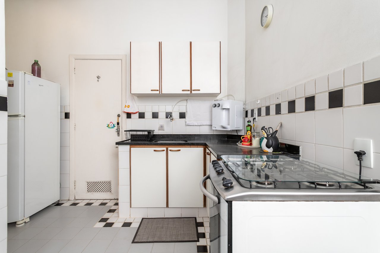 Os 102 m² no IPTU se distribuem entre uma ótima sala com varanda, dois quartos, um banheiro social bem posicionado, espaçoso e com ventilação direta, as dependências completas e uma cozinha clara e bem ventilada por uma janelona. A cozinha e o banheiro já passaram por modernização, com revestimentos brancos e neutros, fáceis para colocar ao seu gosto.