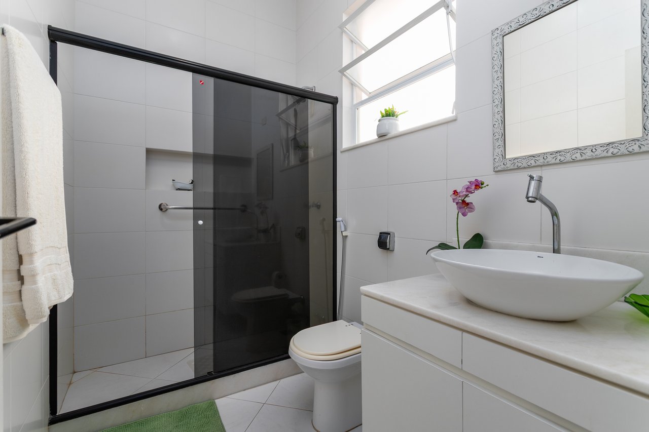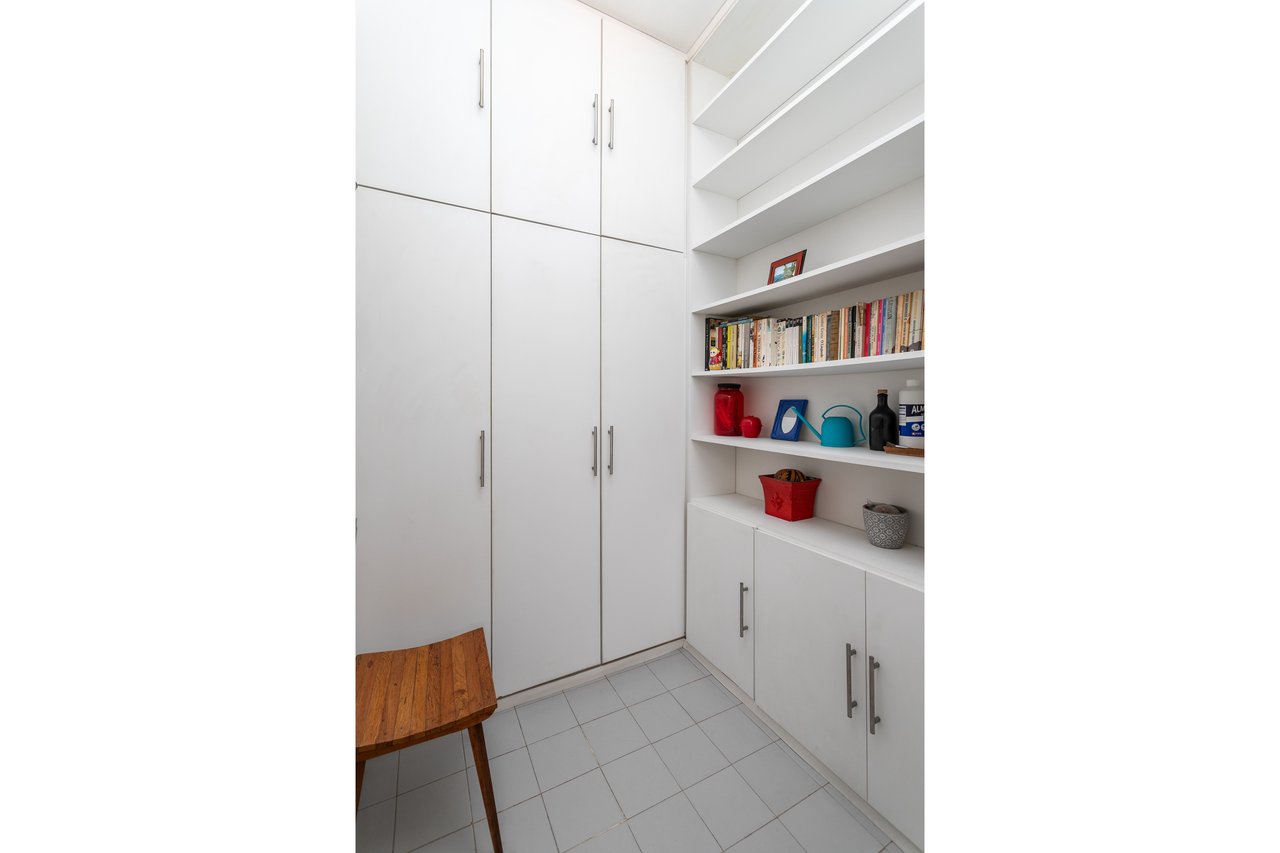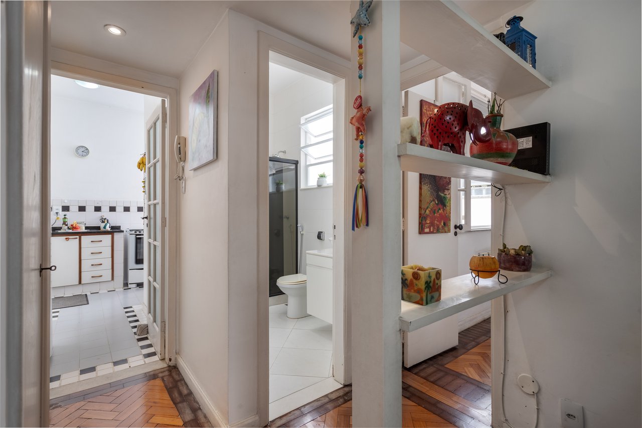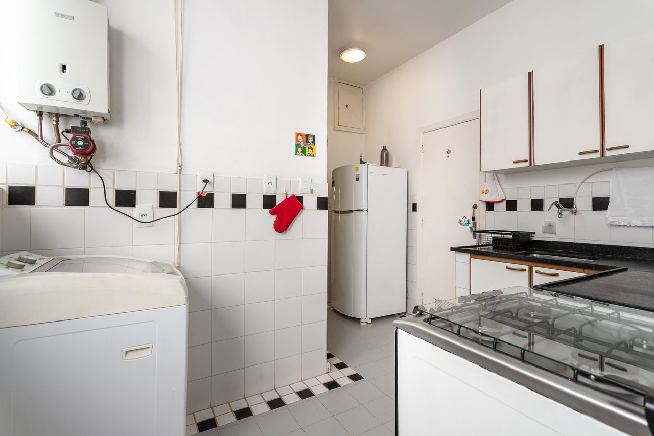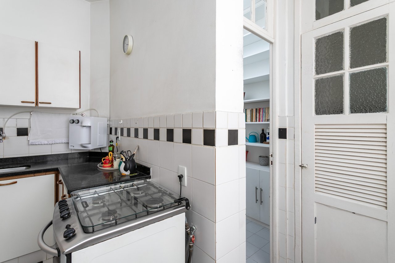 Entre a cozinha e a sala, dois louceiros embutidos ajudam a organizar o dia a dia, ótimos como despensa ou para utensílios, sem ocupar espaço útil. O quartinho de serviço fica junto à cozinha, o que abre a possibilidade de integração: quem quiser pode transformar a área em uma grande copa-cozinha. E, embora não tenha passado por reforma completa recentemente, o apartamento está em muito bom estado geral, e a parte elétrica já foi atualizada com disjuntores modernos. Todo o conjunto transmite a sensação de um apartamento bem cuidado ao longo dos anos.