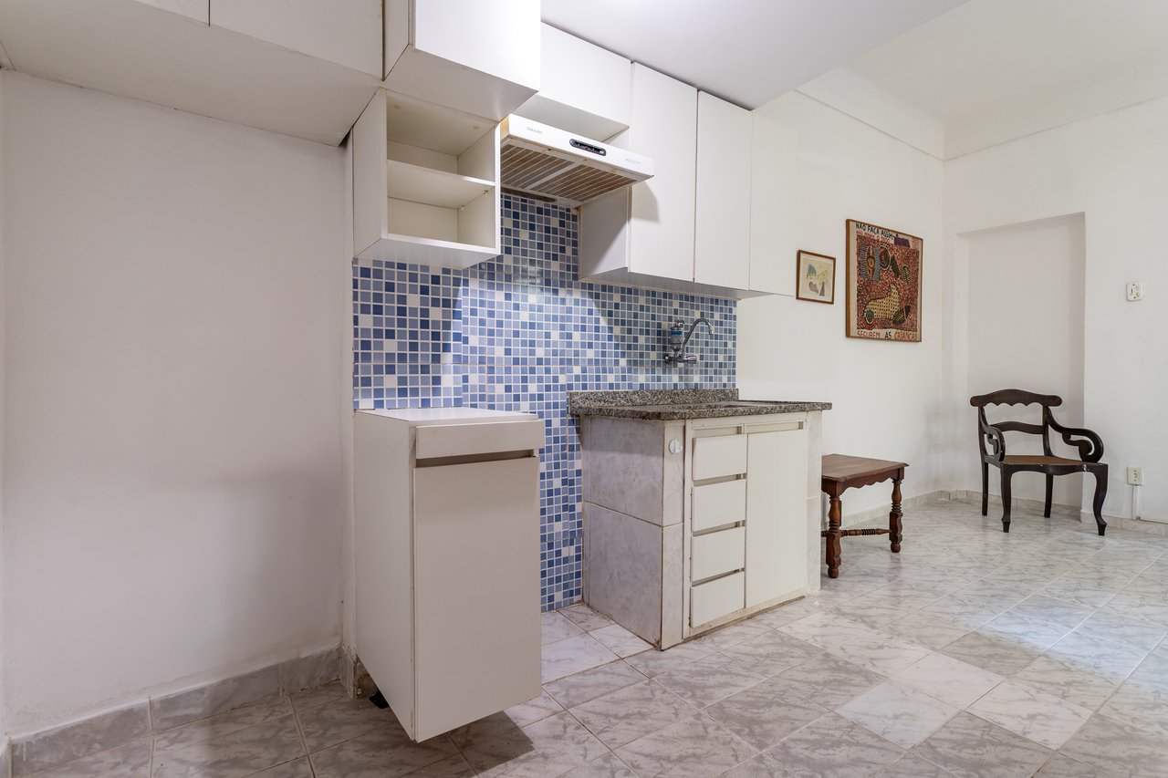 A configuração atual inclui sala com cozinha integrada, quarto com um tamanho muito bom, banheiro social e área externa. Mas aqui, o convite é para imaginar: o apartamento merece uma reforma, o que significa que as possibilidades são infinitas. É a chance de moldar cada detalhe ao seu gosto: dos acabamentos aos espaços, compondo seu cantinho único e especial.