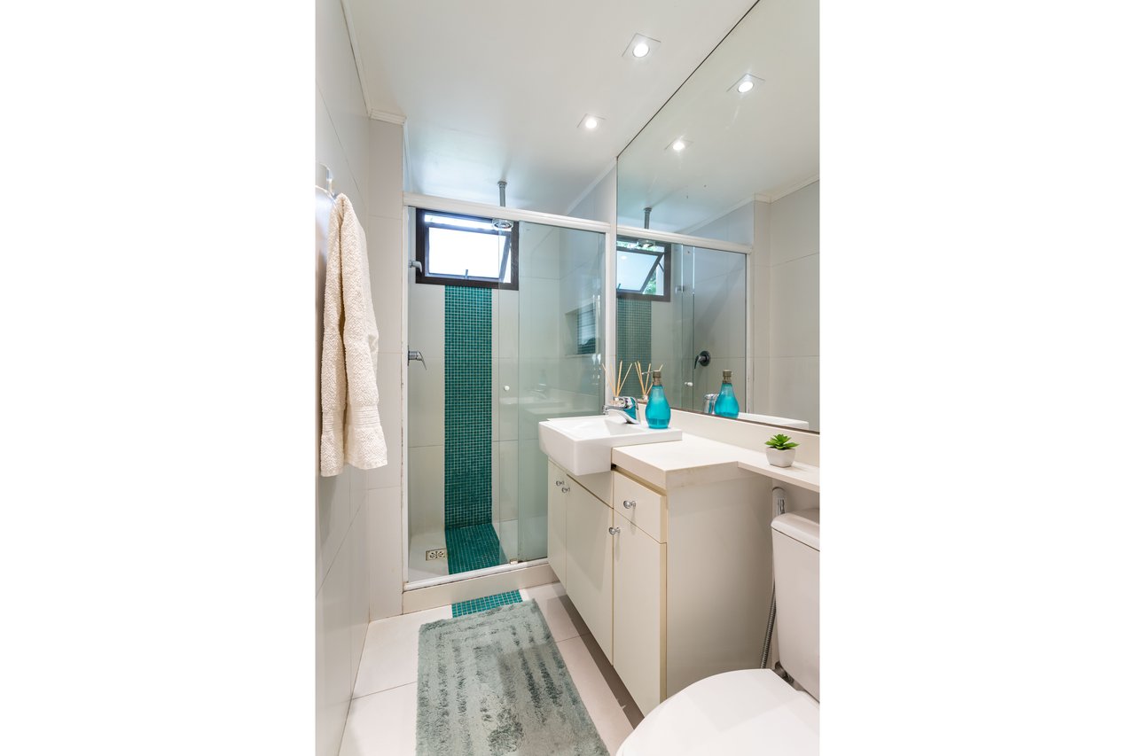 Os banheiros são amplos, com acabamentos muito bons, e o da suíte ainda conta com ventilação direta.